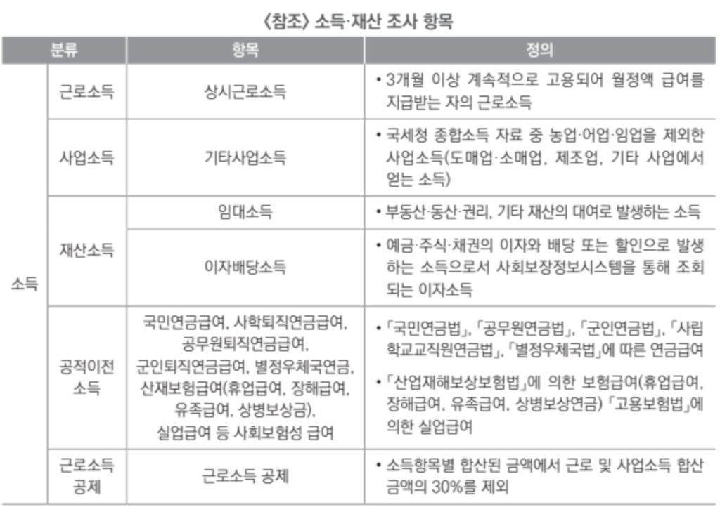 소득 평가액 = 근로소득 + 사업소득 + 재산소득 + 공적이전소득* -근로/사업소득공제